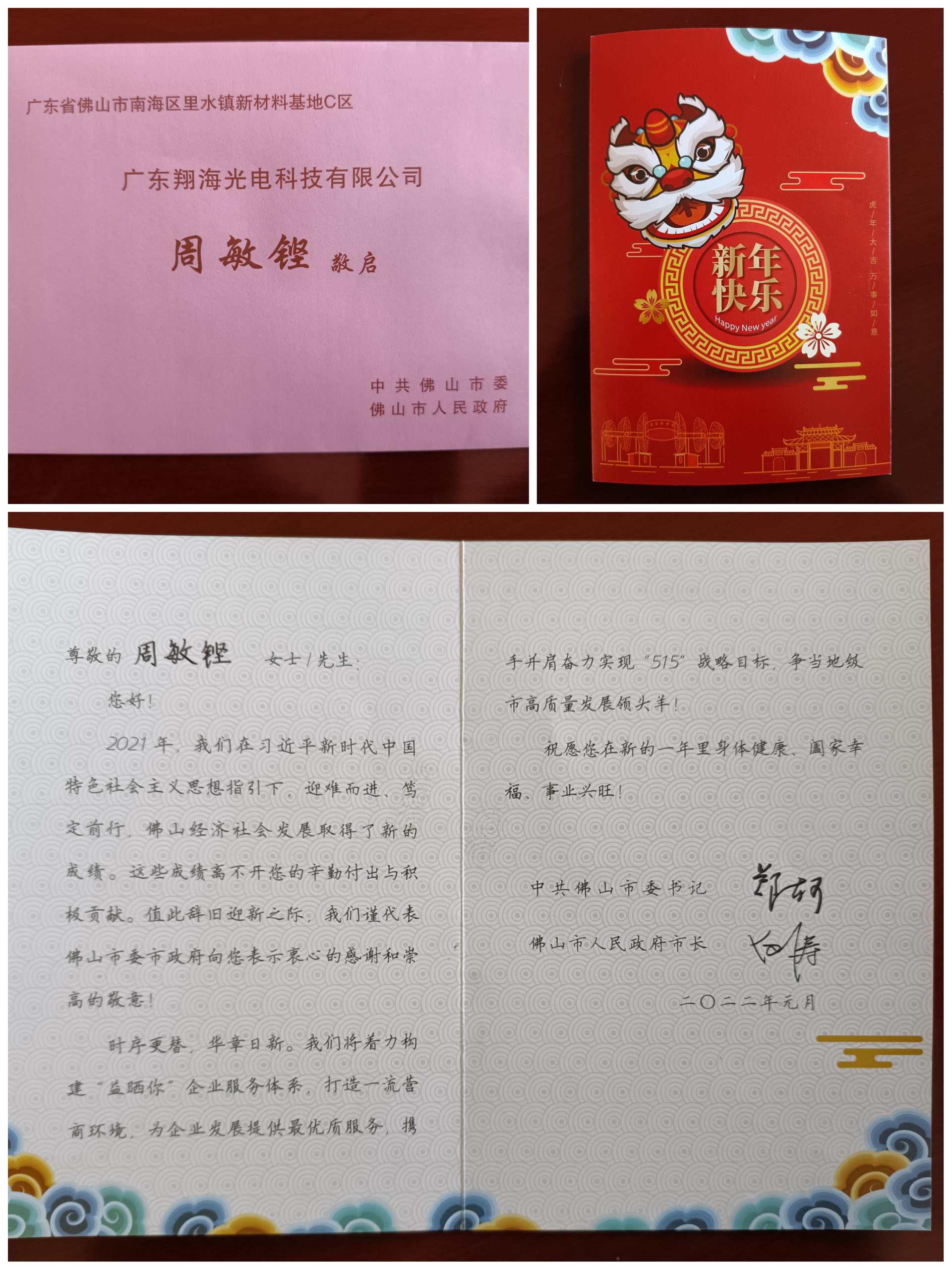 值此辞旧迎新之际,广东翔海光电科技有限公司收到了来自佛山市委、市政府的新年贺卡,深切感受到了党和政府对企业的关心与祝福,倍感温暖、备受鼓舞。